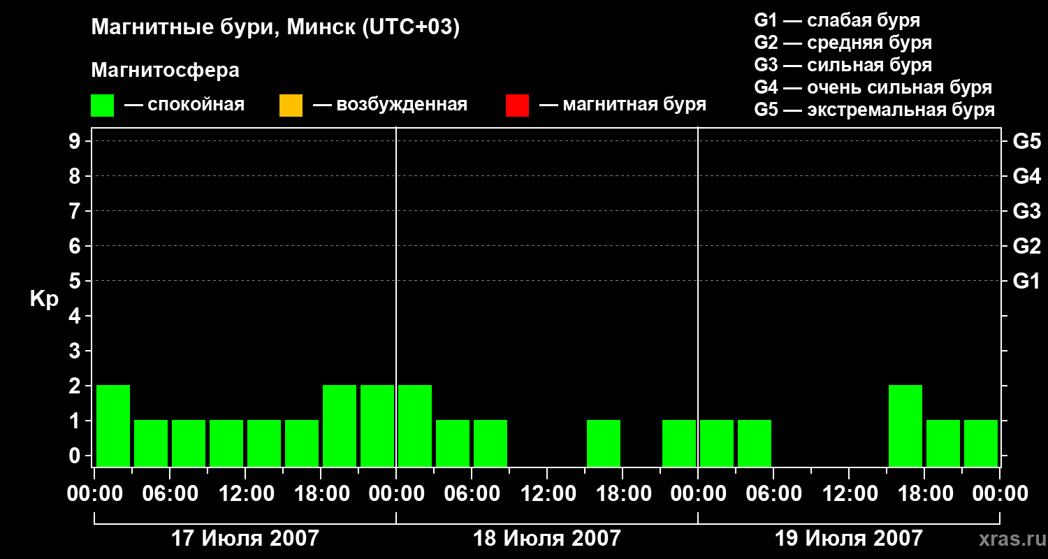 Изменения геомагнитного индекса Kp с 17 по 19 июля 2007 года для средних широт