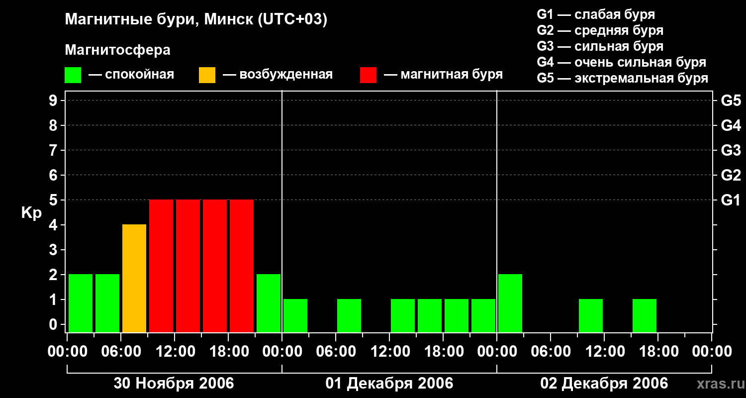 Изменения геомагнитного индекса Kp с 30 ноября по 2 декабря 2006 года для средних широт