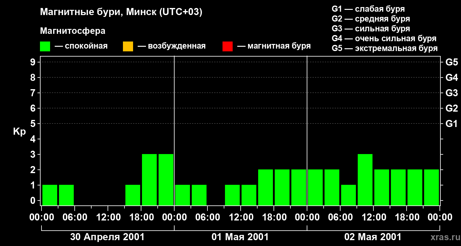 Изменения геомагнитного индекса Kp с 30 апреля по 2 мая 2001 года для средних широт