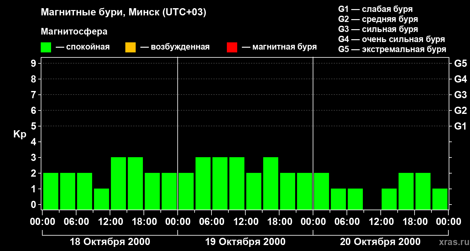 Изменения геомагнитного индекса Kp с 18 по 20 октября 2000 года для средних широт