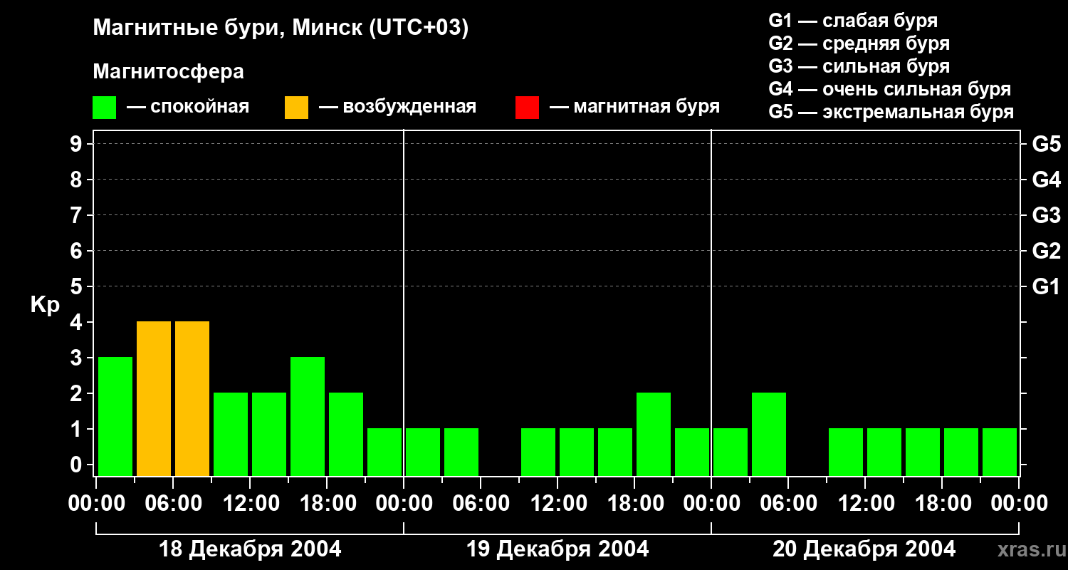Изменения геомагнитного индекса Kp с 18 по 20 декабря 2004 года для средних широт