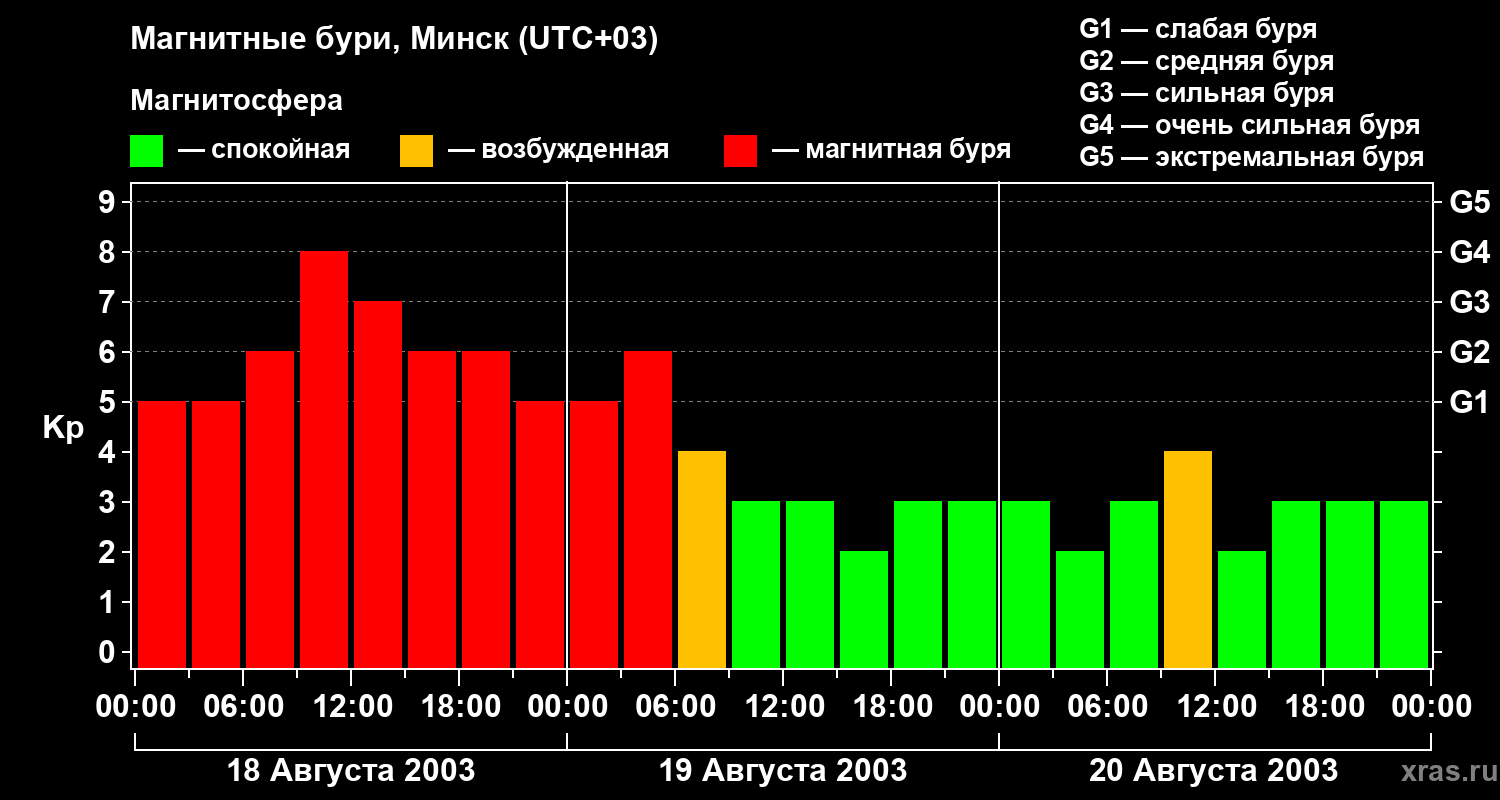 Изменения геомагнитного индекса Kp с 18 по 20 августа 2003 года для средних широт