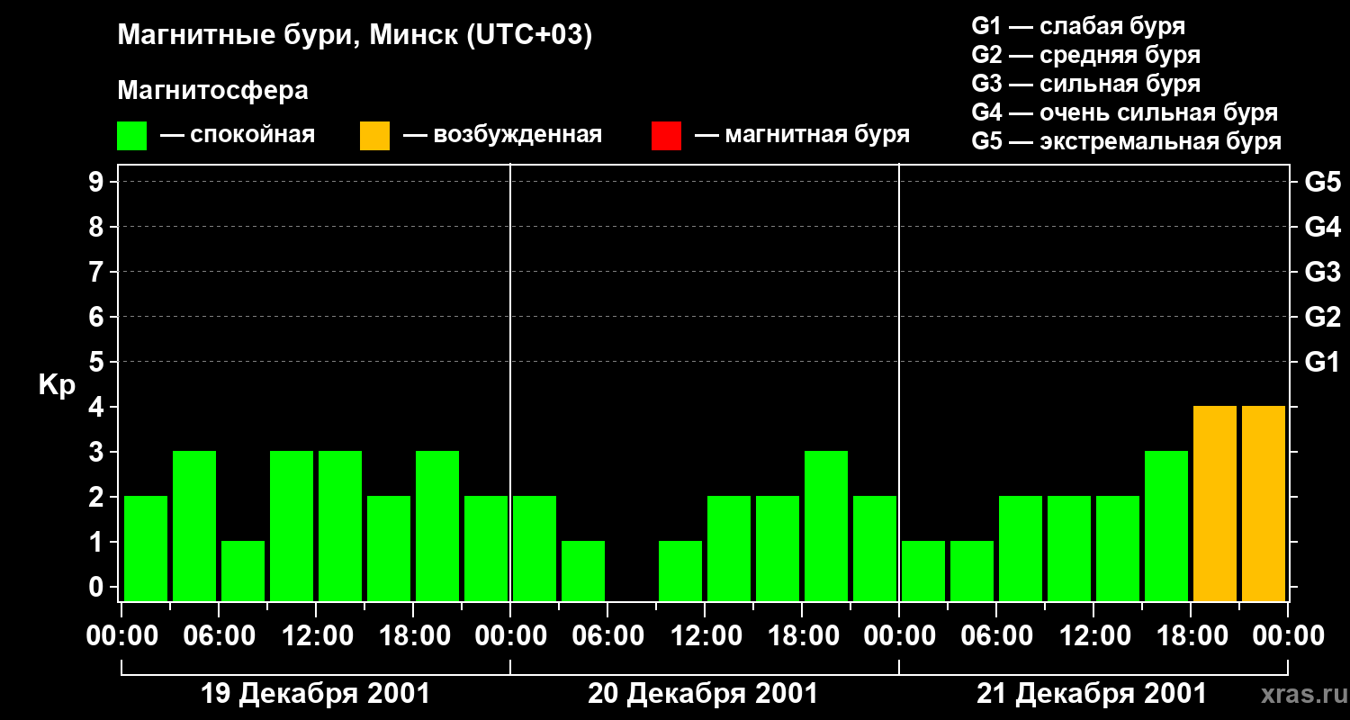 Изменения геомагнитного индекса Kp с 19 по 21 декабря 2001 года для средних широт
