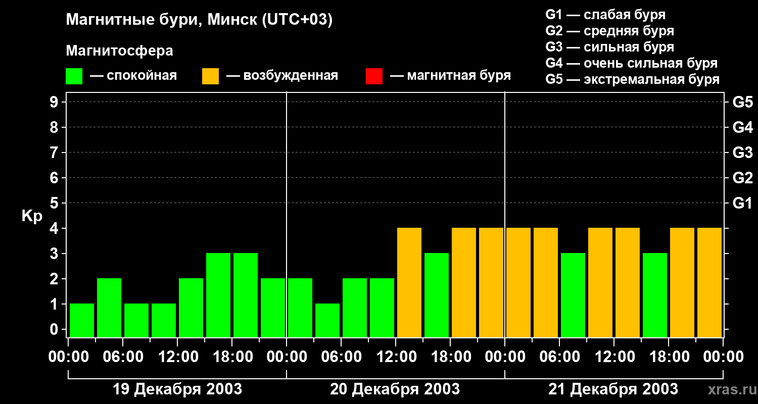 Изменения геомагнитного индекса Kp с 19 по 21 декабря 2003 года для средних широт