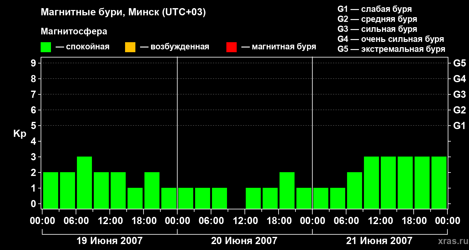 Изменения геомагнитного индекса Kp с 19 по 21 июня 2007 года для средних широт