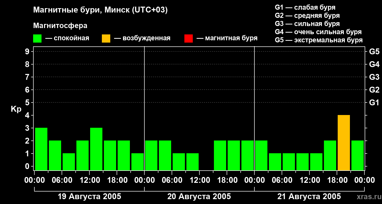 Изменения геомагнитного индекса Kp с 19 по 21 августа 2005 года для средних широт