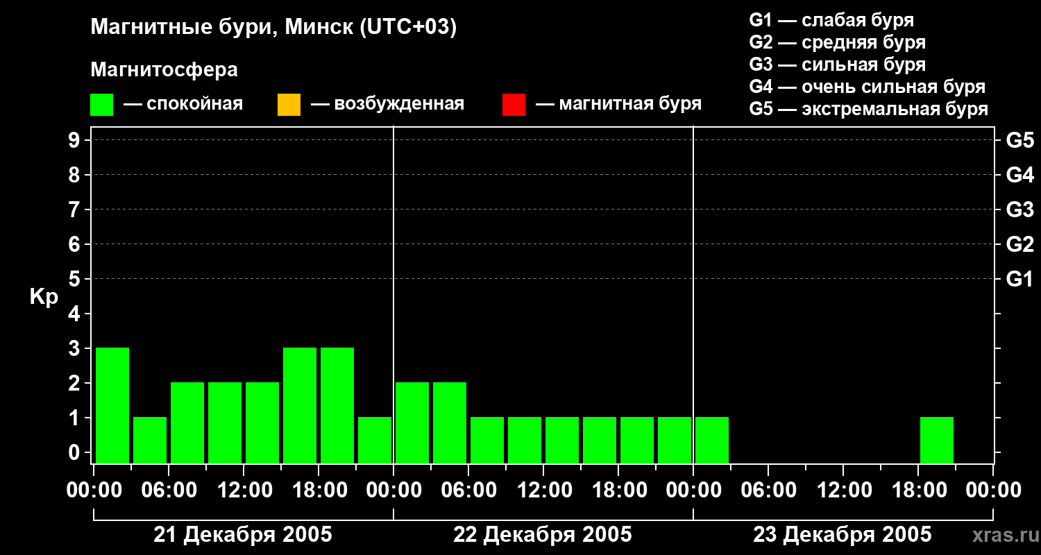 Изменения геомагнитного индекса Kp с 21 по 23 декабря 2005 года для средних широт