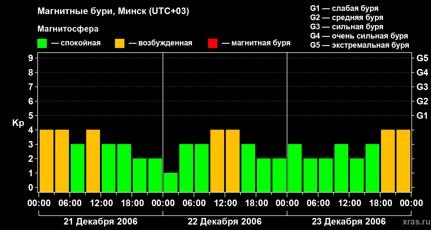 Изменения геомагнитного индекса Kp с 21 по 23 декабря 2006 года для средних широт
