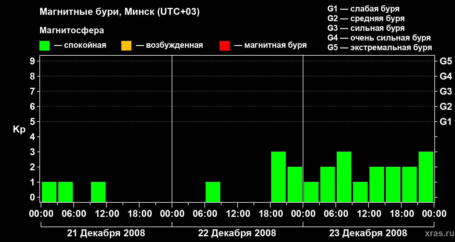 Изменения геомагнитного индекса Kp с 21 по 23 декабря 2008 года для средних широт