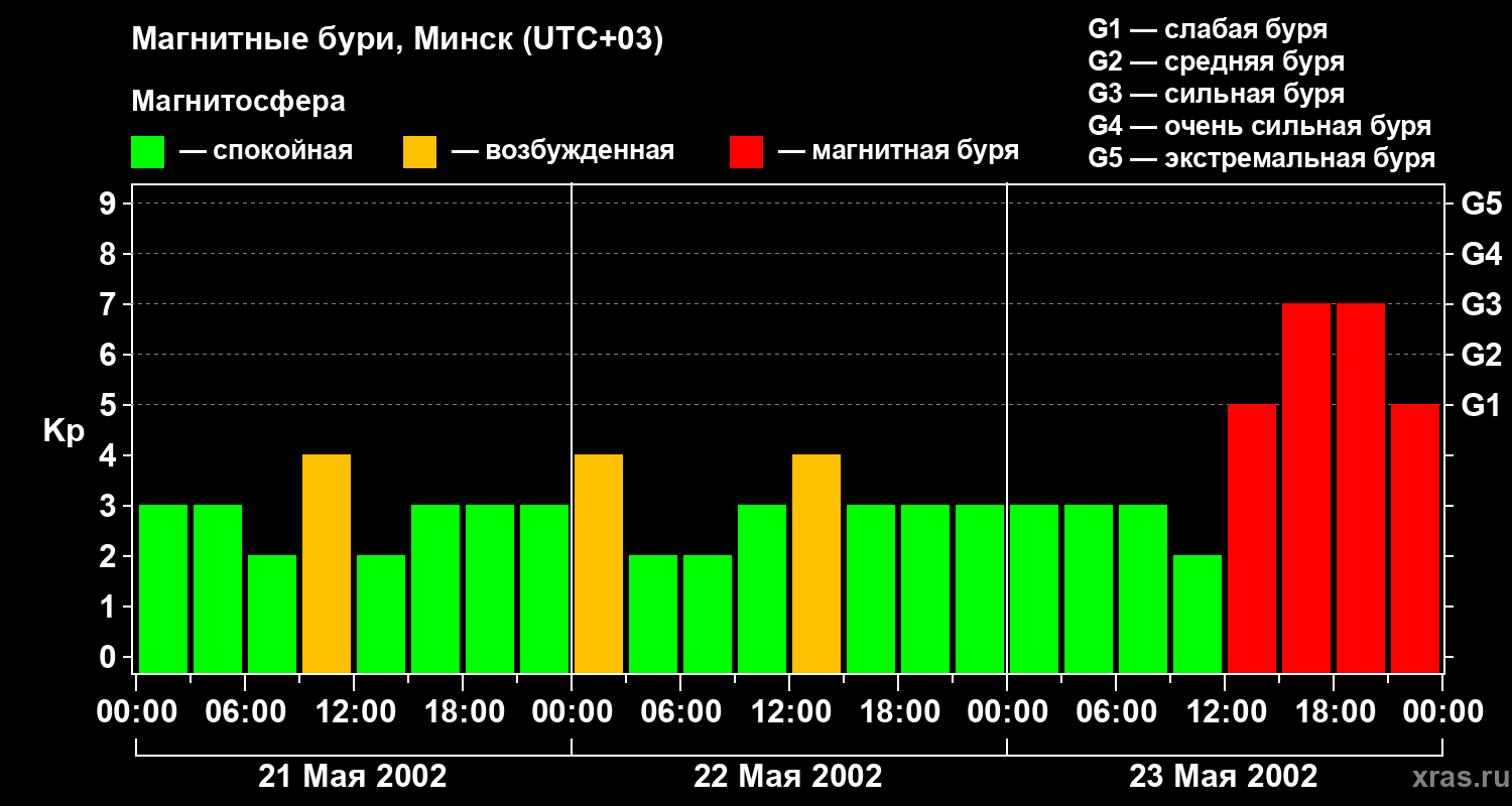 Изменения геомагнитного индекса Kp с 21 по 23 мая 2002 года для средних широт