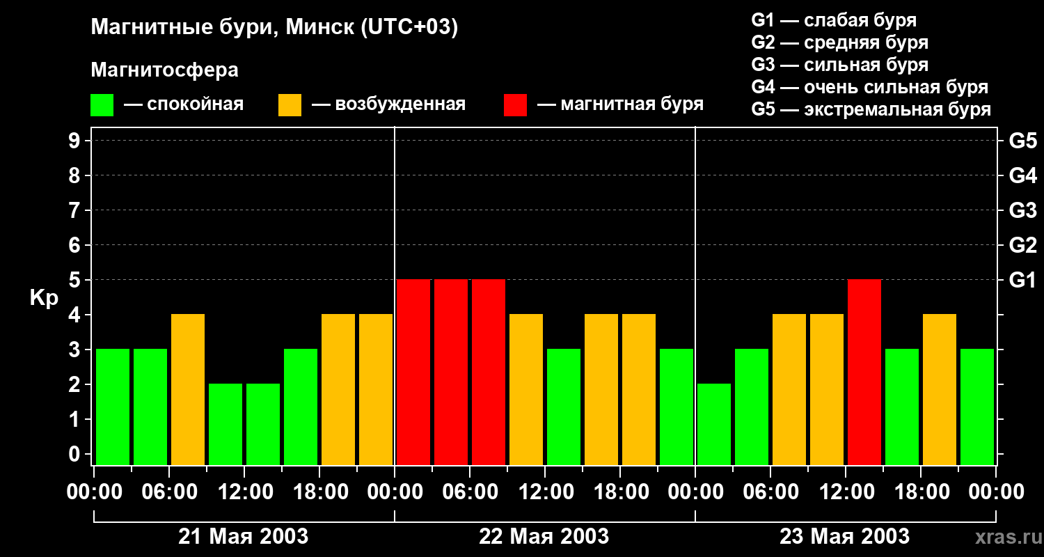 Изменения геомагнитного индекса Kp с 21 по 23 мая 2003 года для средних широт