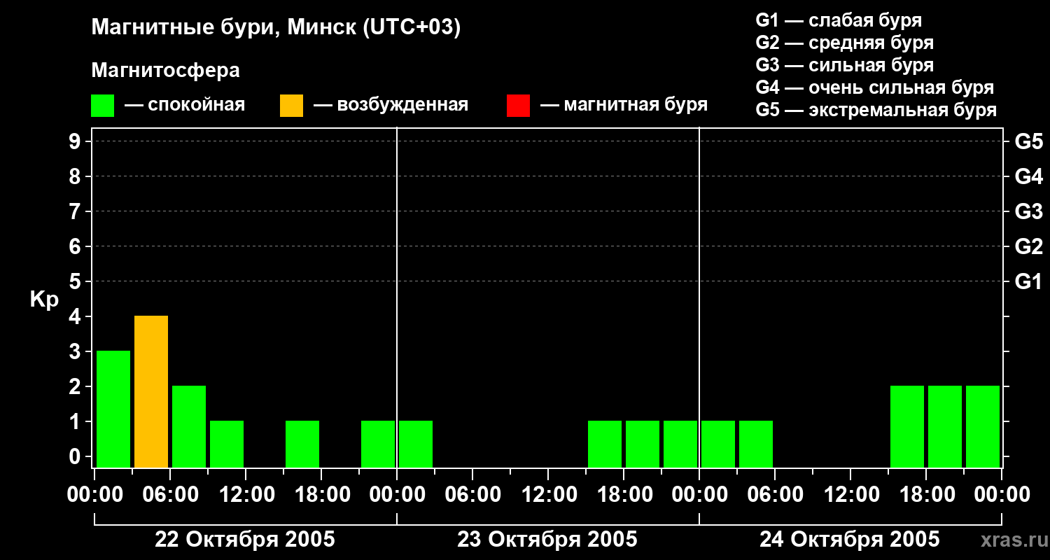 Изменения геомагнитного индекса Kp с 22 по 24 октября 2005 года для средних широт