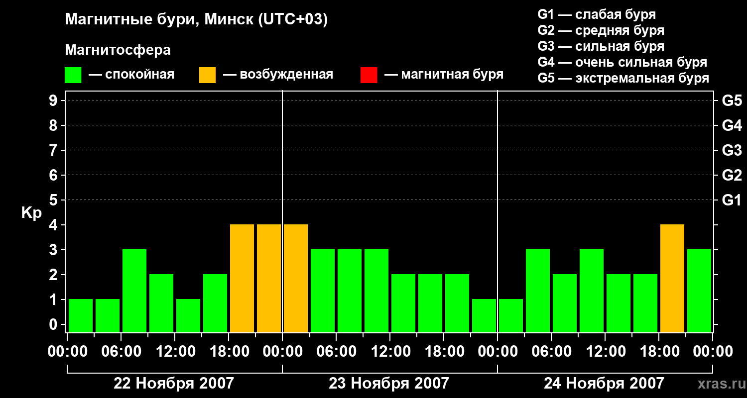 Изменения геомагнитного индекса Kp с 22 по 24 ноября 2007 года для средних широт
