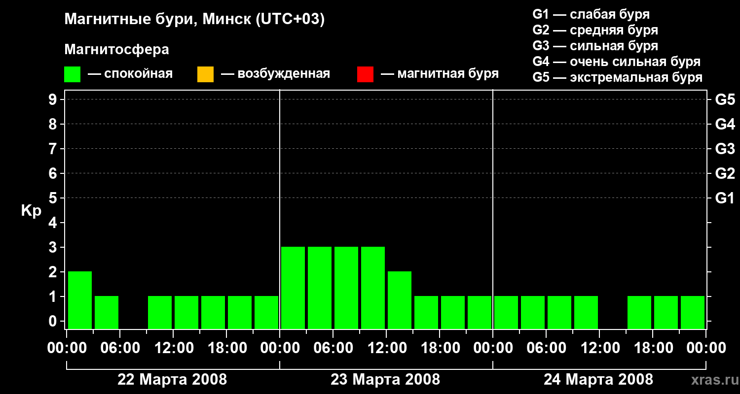 Изменения геомагнитного индекса Kp с 22 по 24 марта 2008 года для средних широт