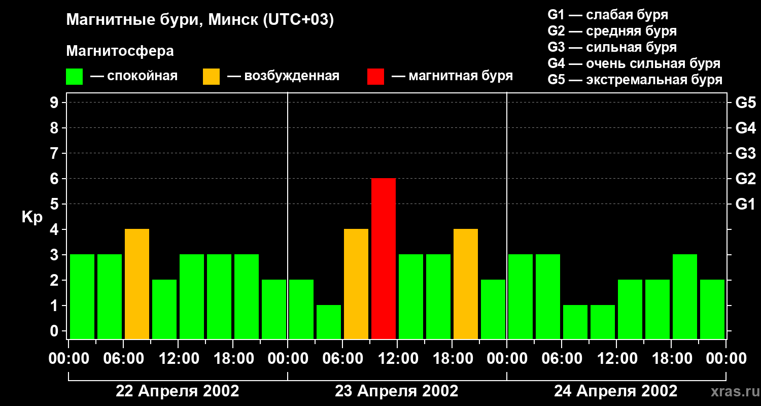 Изменения геомагнитного индекса Kp с 22 по 24 апреля 2002 года для средних широт
