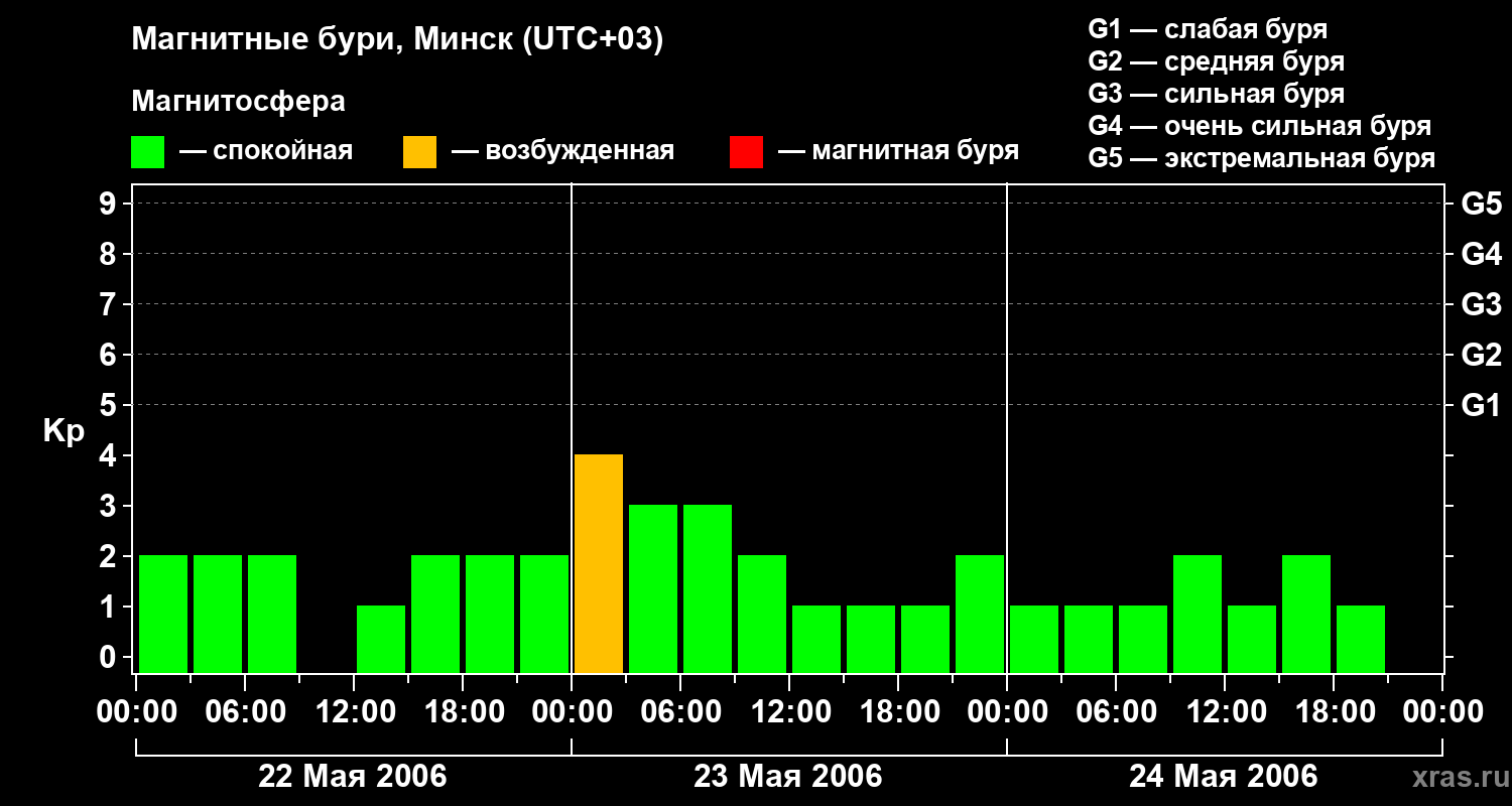 Изменения геомагнитного индекса Kp с 22 по 24 мая 2006 года для средних широт