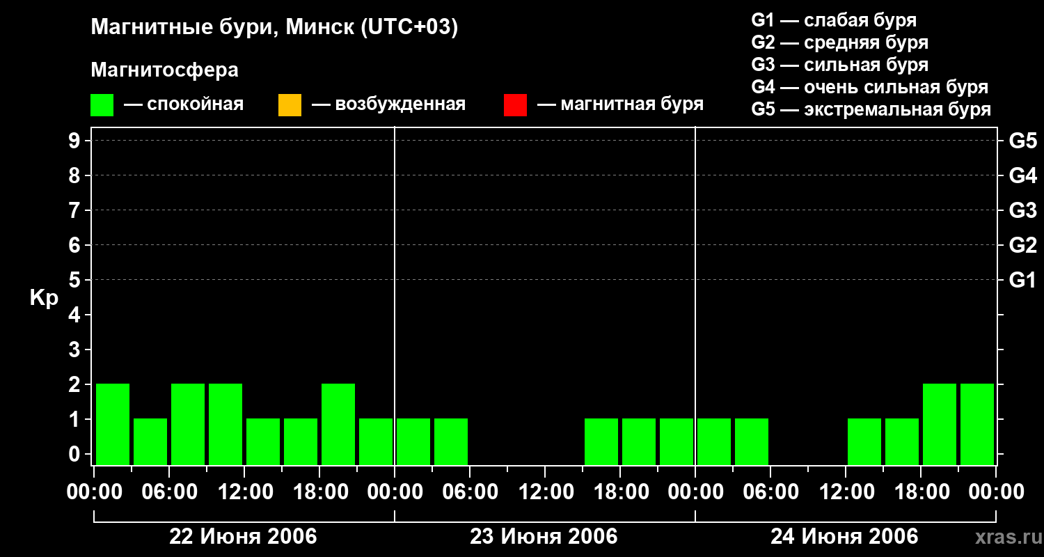 Изменения геомагнитного индекса Kp с 22 по 24 июня 2006 года для средних широт