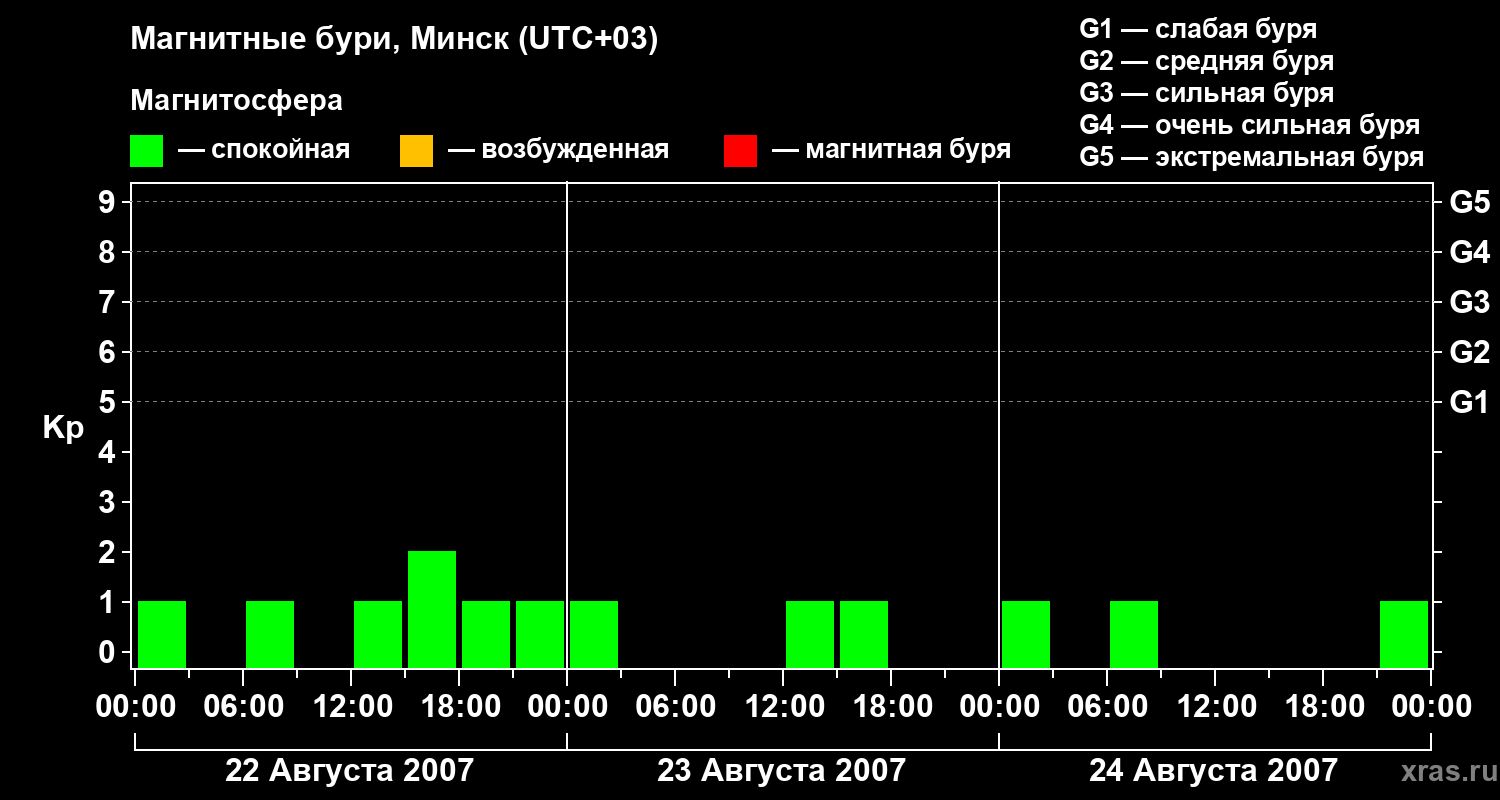 Изменения геомагнитного индекса Kp с 22 по 24 августа 2007 года для средних широт