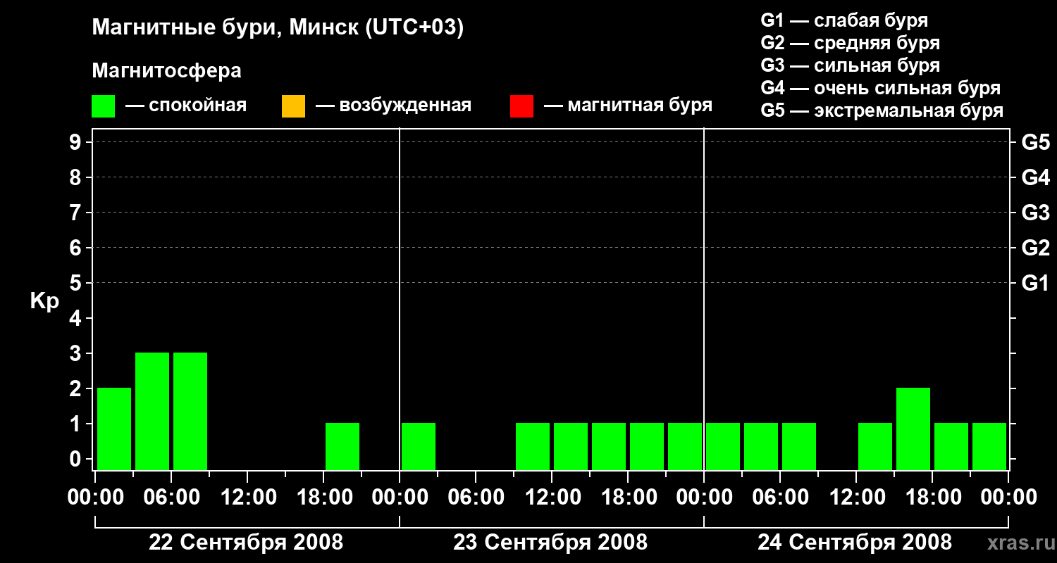 Изменения геомагнитного индекса Kp с 22 по 24 сентября 2008 года для средних широт