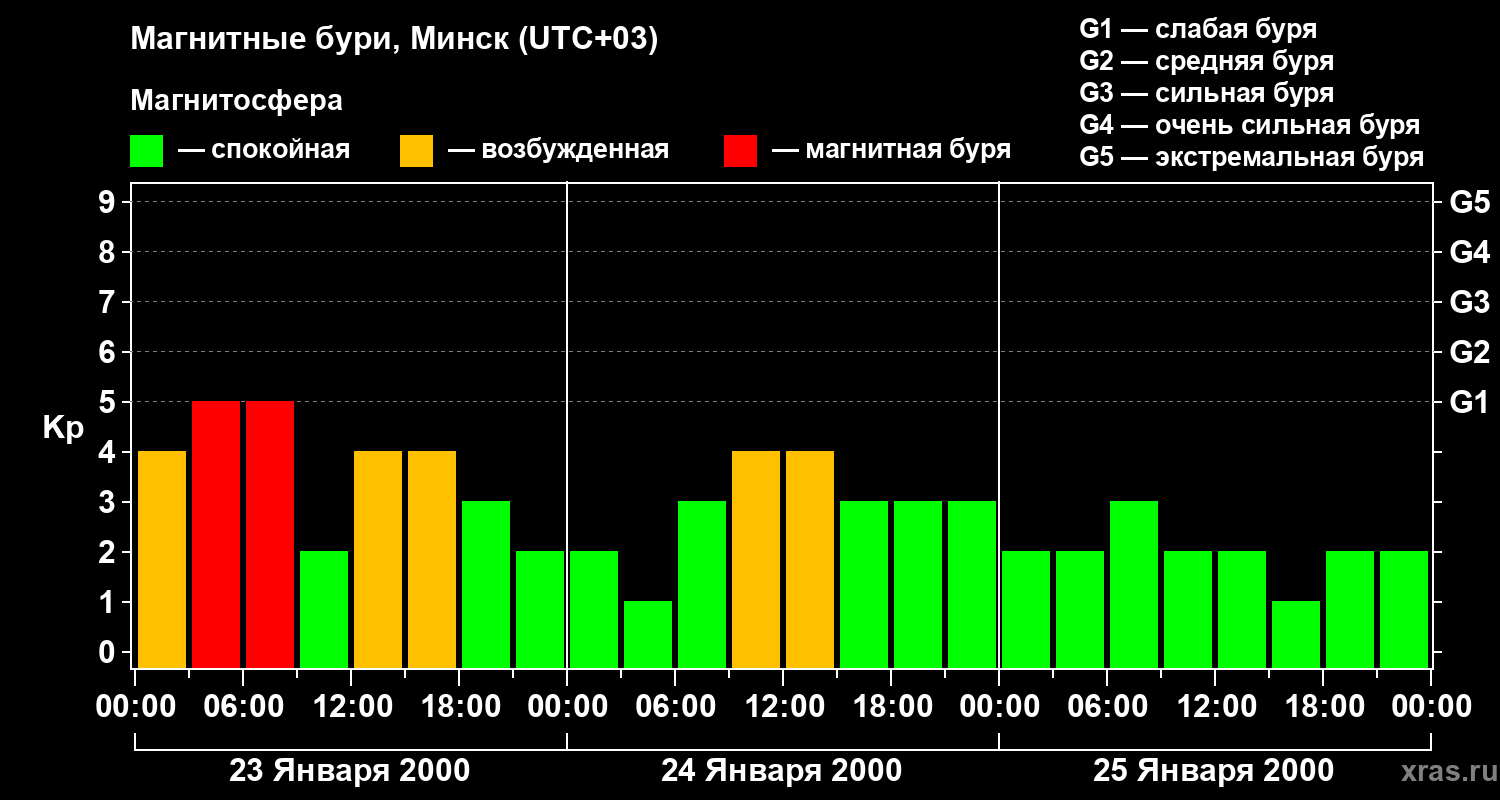 Изменения геомагнитного индекса Kp с 23 по 25 января 2000 года для средних широт