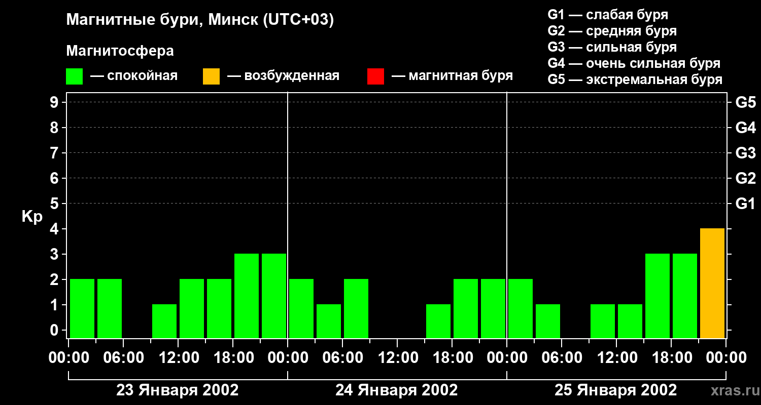 Изменения геомагнитного индекса Kp с 23 по 25 января 2002 года для средних широт