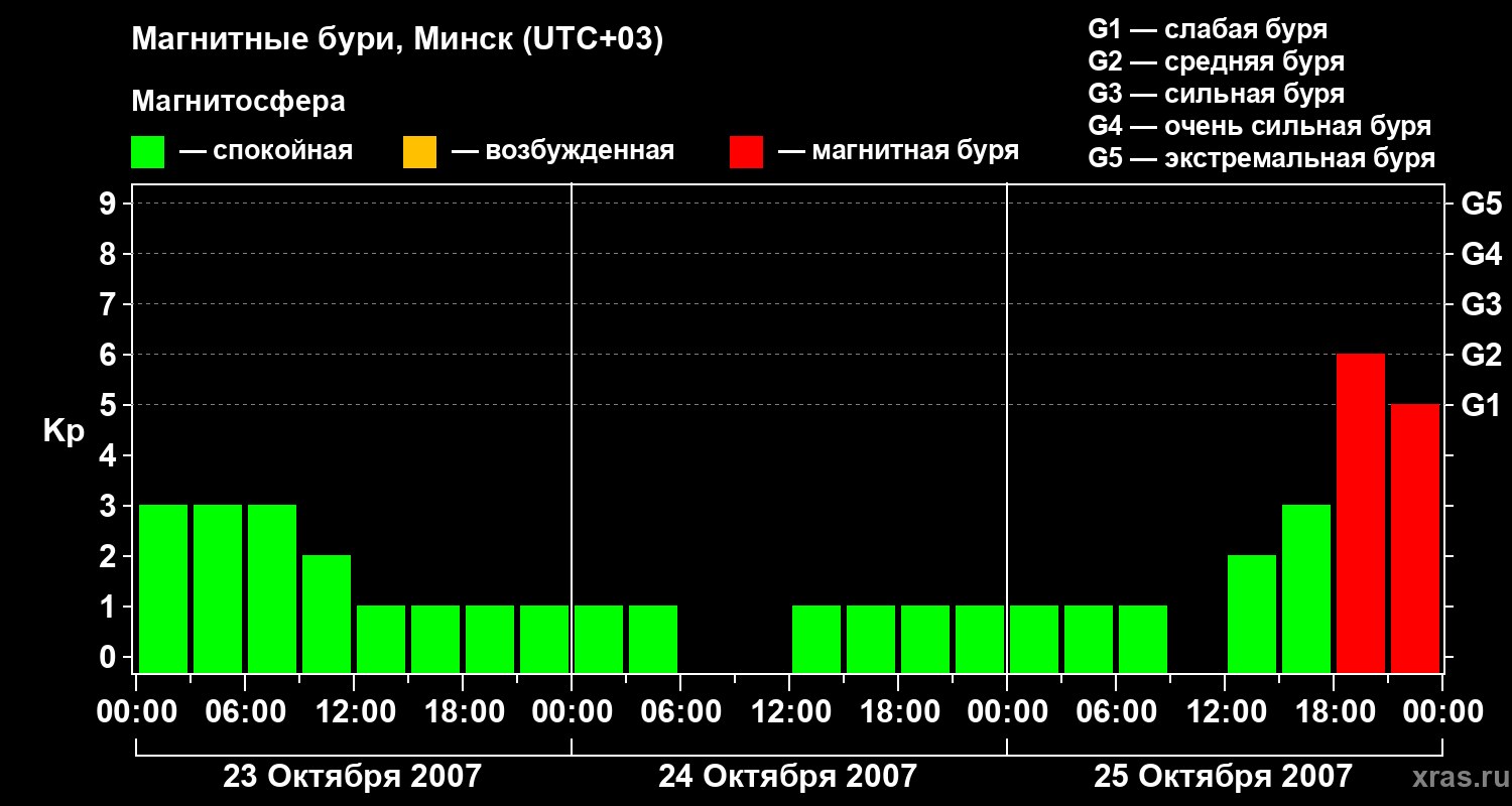 Изменения геомагнитного индекса Kp с 23 по 25 октября 2007 года для средних широт
