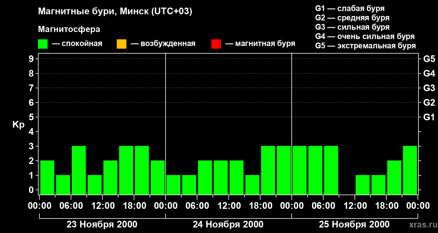 Изменения геомагнитного индекса Kp с 23 по 25 ноября 2000 года для средних широт