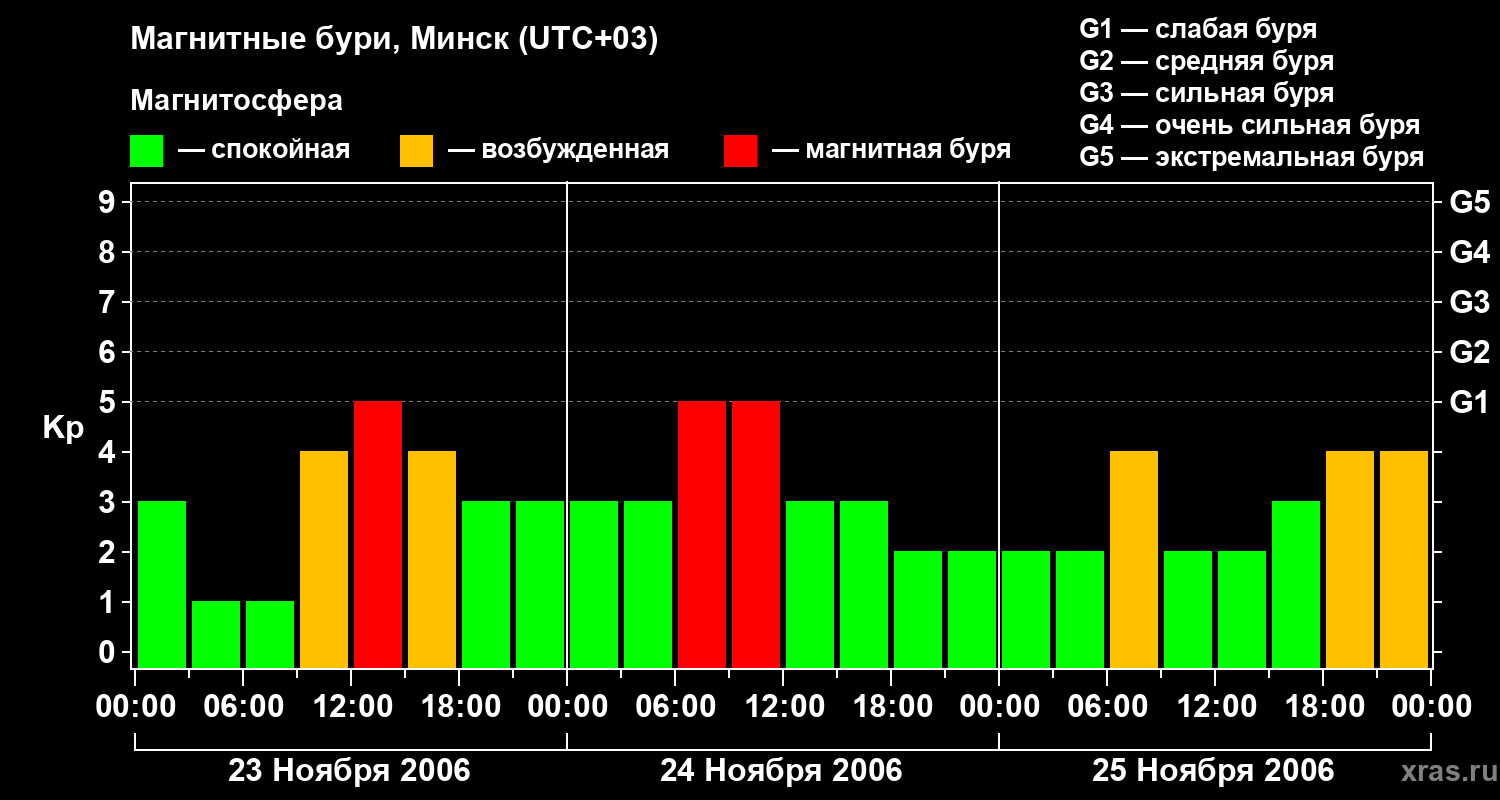 Изменения геомагнитного индекса Kp с 23 по 25 ноября 2006 года для средних широт