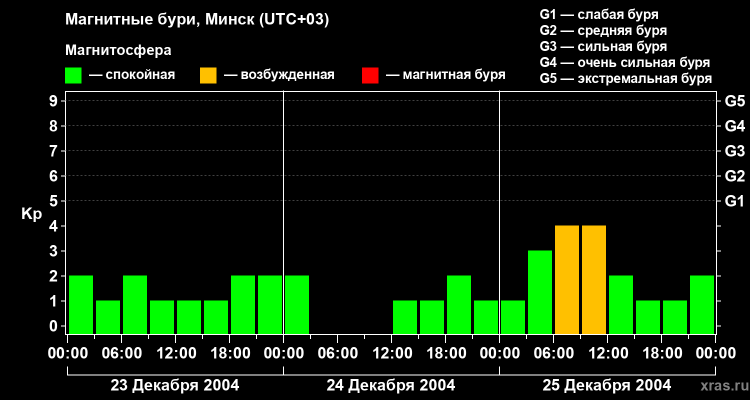 Изменения геомагнитного индекса Kp с 23 по 25 декабря 2004 года для средних широт