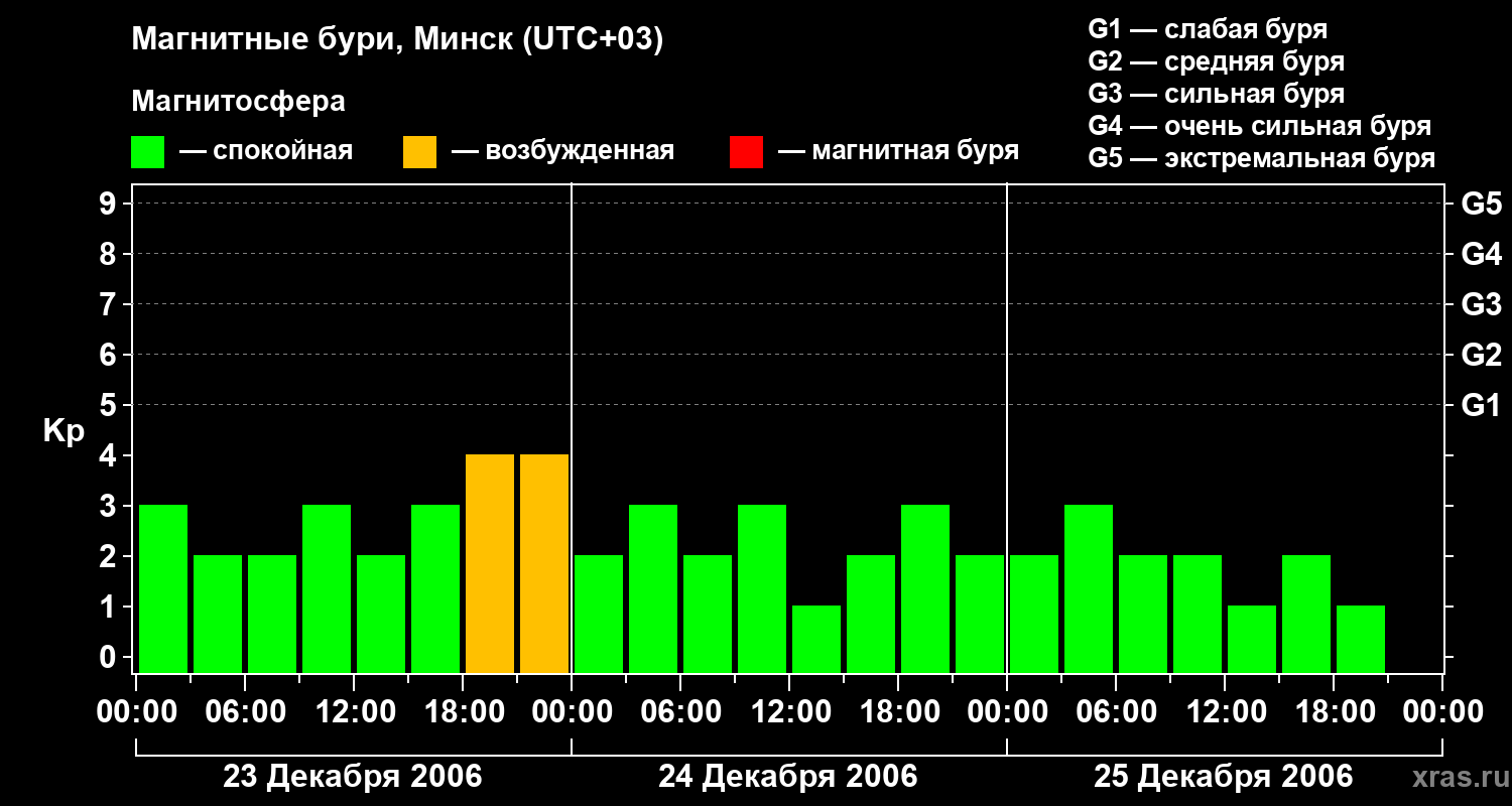 Изменения геомагнитного индекса Kp с 23 по 25 декабря 2006 года для средних широт