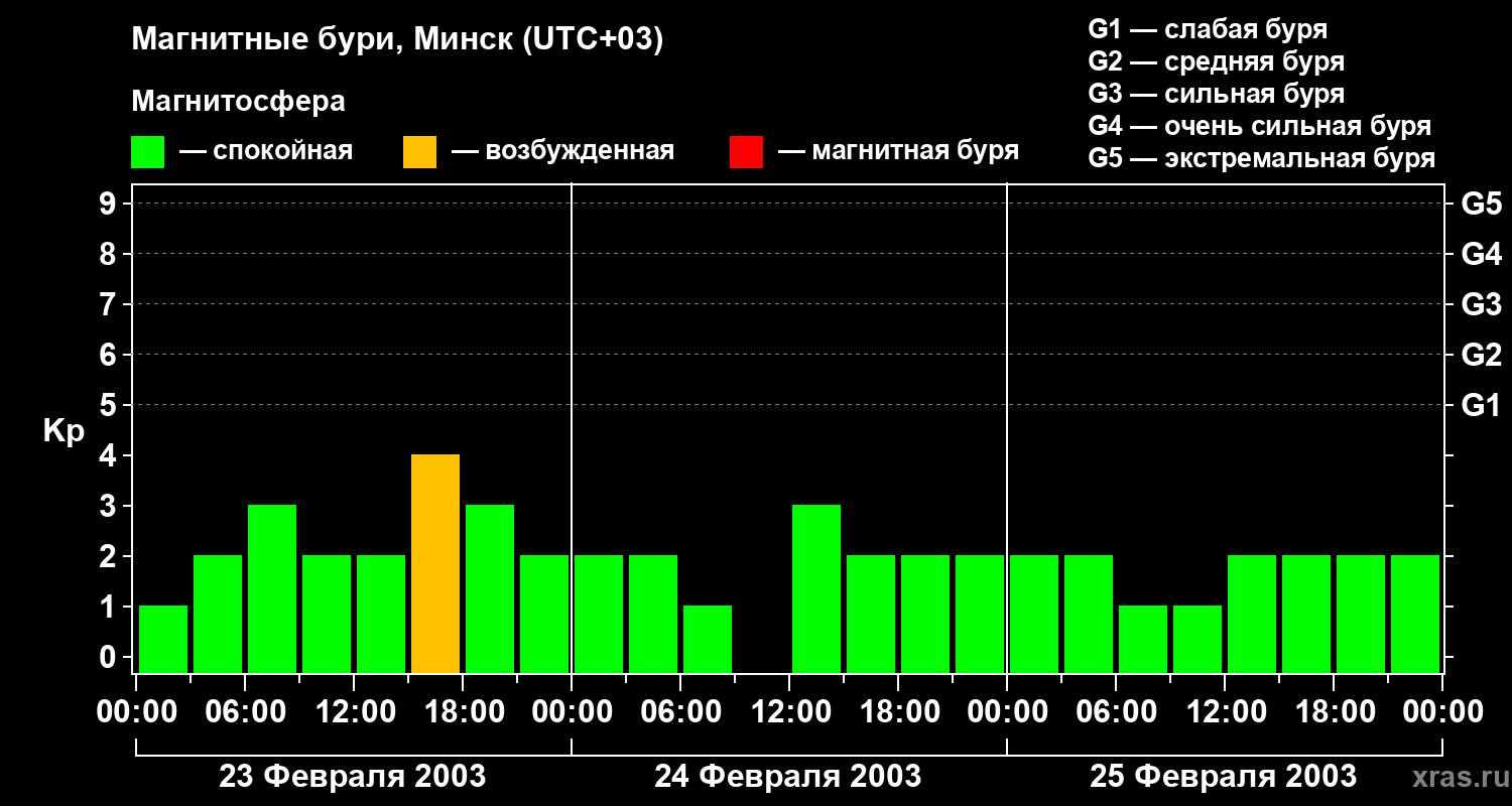 Изменения геомагнитного индекса Kp с 23 по 25 февраля 2003 года для средних широт