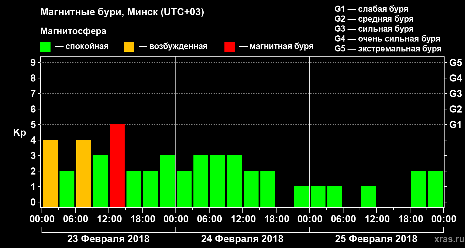 Изменения геомагнитного индекса Kp с 23 по 25 февраля 2018 года для средних широт