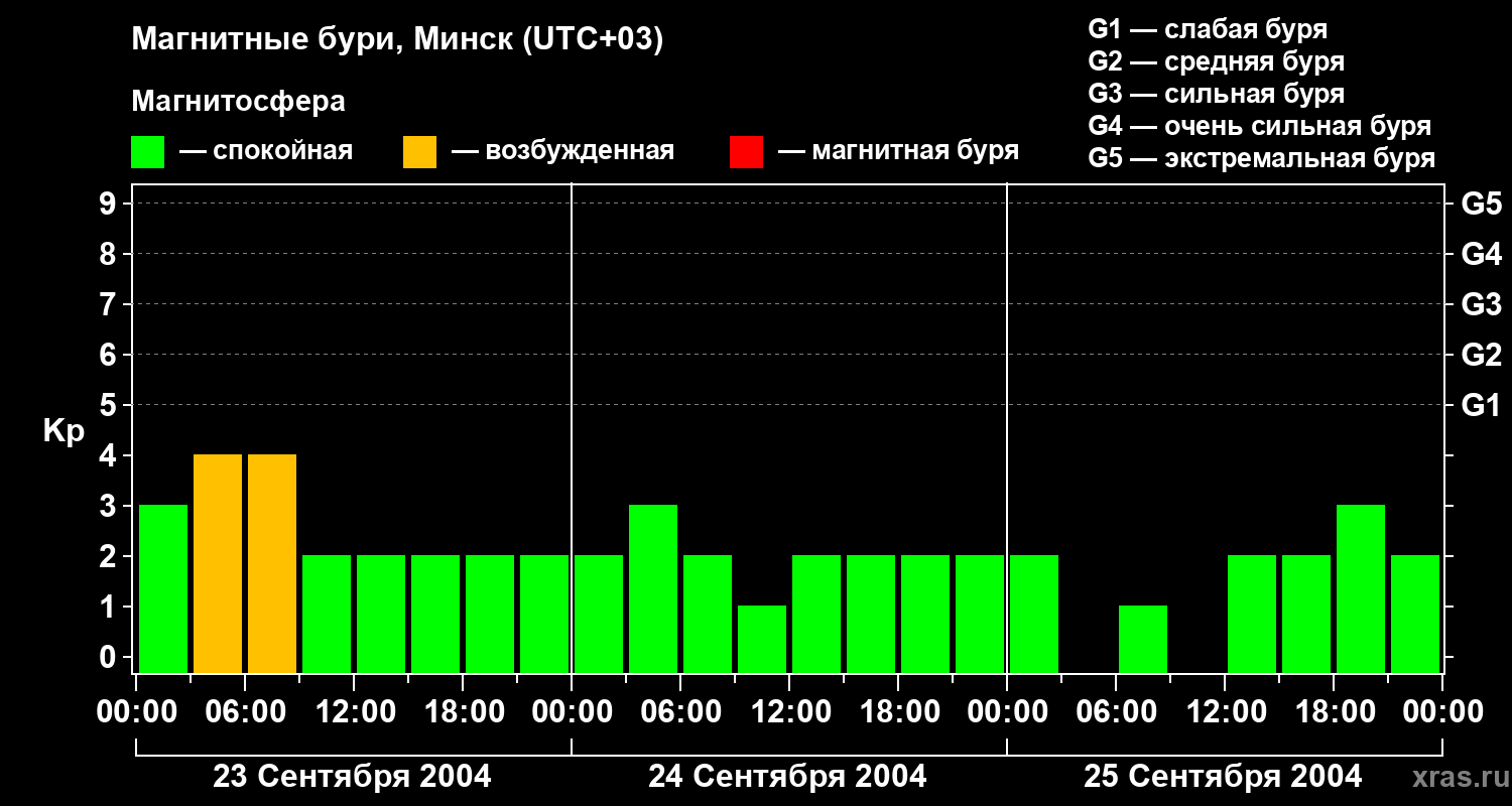 Изменения геомагнитного индекса Kp с 23 по 25 сентября 2004 года для средних широт