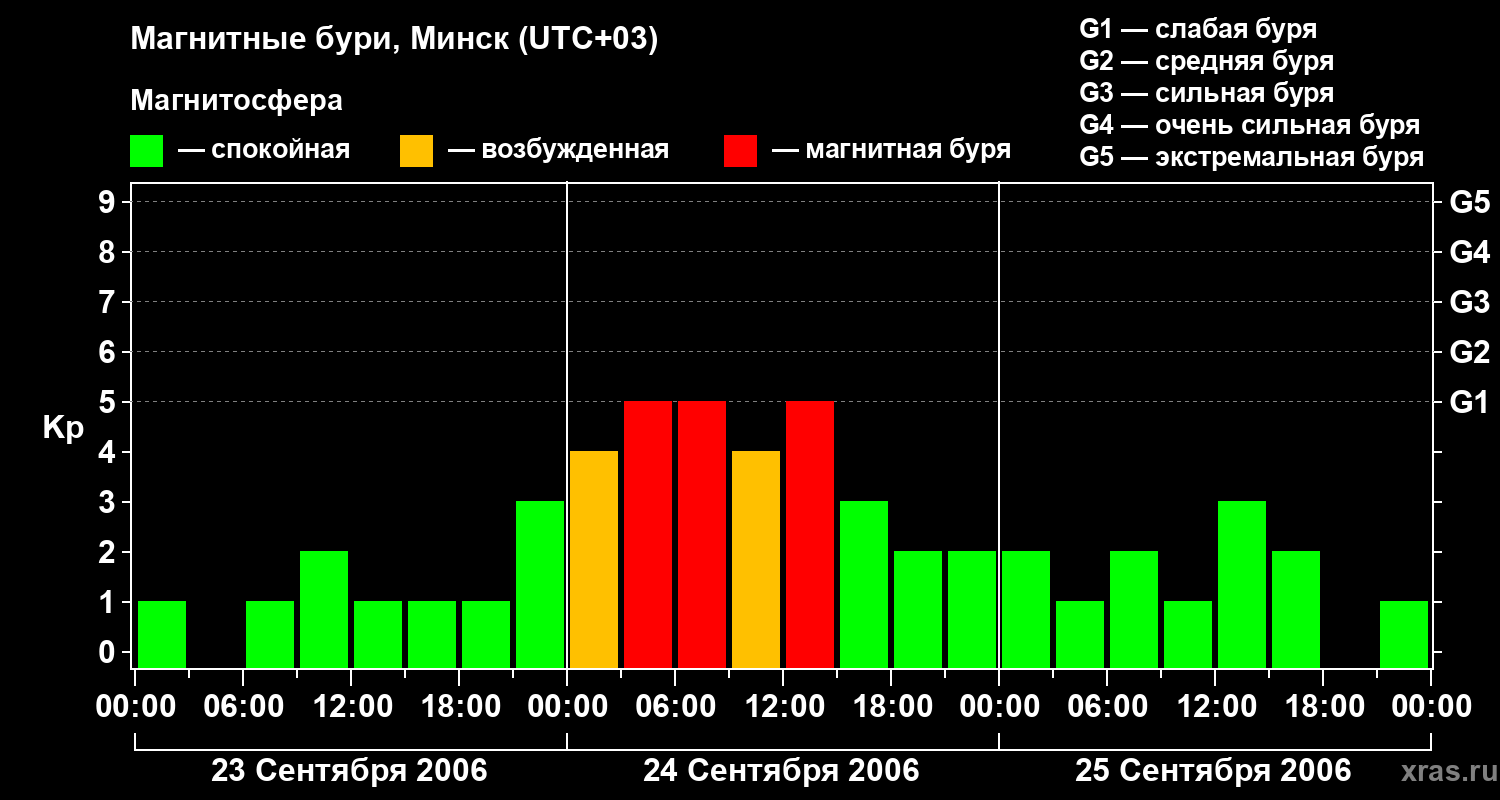 Изменения геомагнитного индекса Kp с 23 по 25 сентября 2006 года для средних широт
