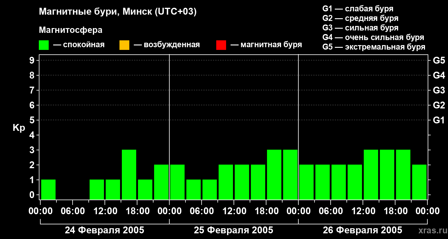 Изменения геомагнитного индекса Kp с 24 по 26 февраля 2005 года для средних широт