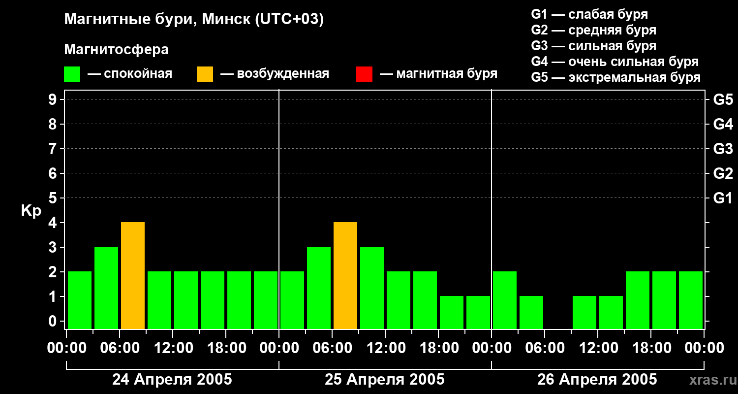 Изменения геомагнитного индекса Kp с 24 по 26 апреля 2005 года для средних широт