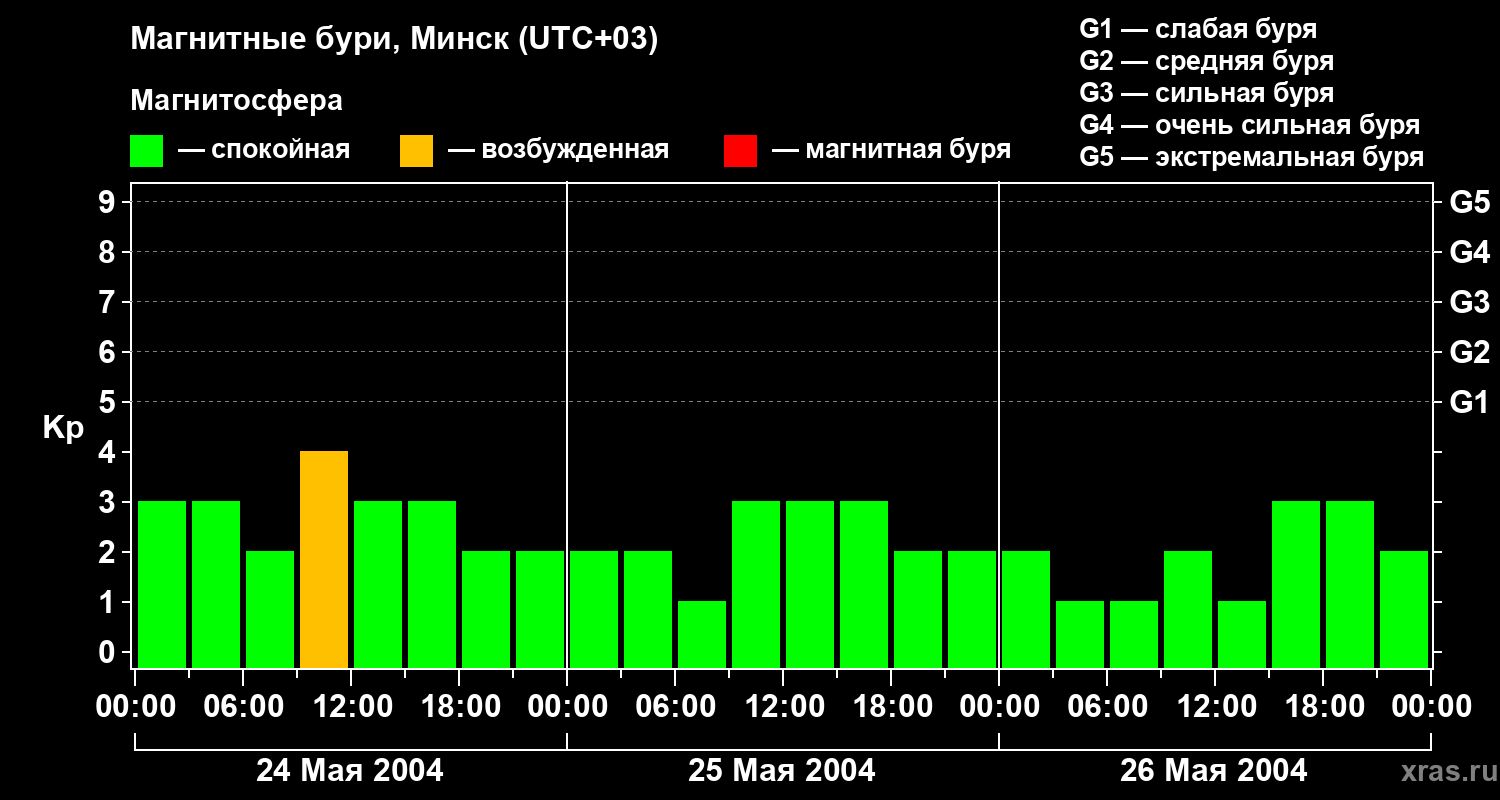 Изменения геомагнитного индекса Kp с 24 по 26 мая 2004 года для средних широт