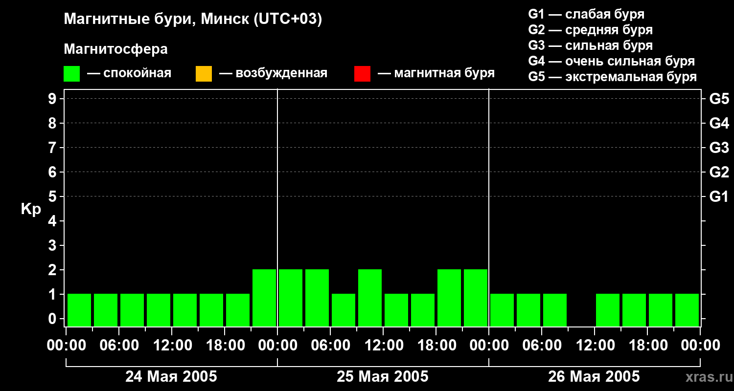 Изменения геомагнитного индекса Kp с 24 по 26 мая 2005 года для средних широт
