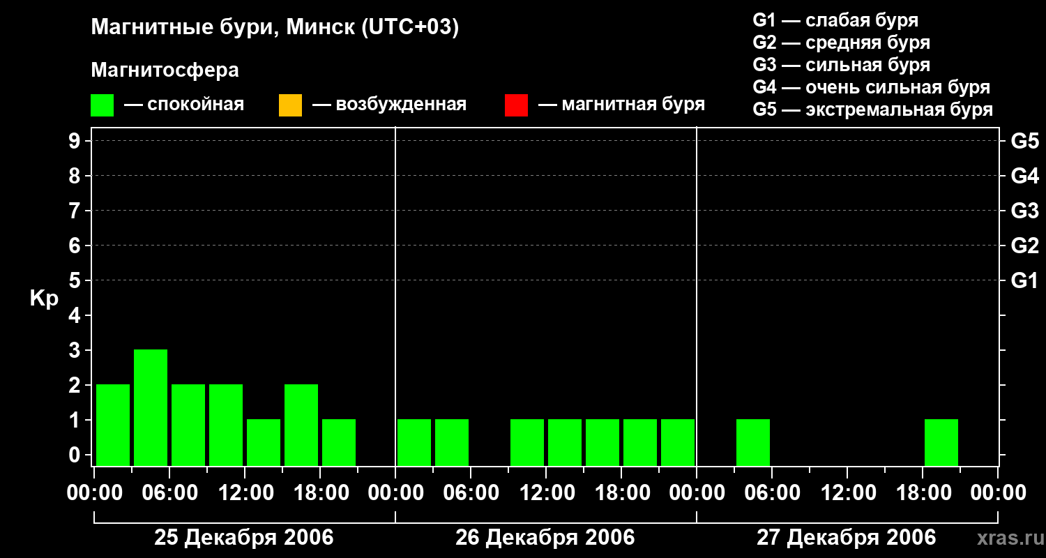 Изменения геомагнитного индекса Kp с 25 по 27 декабря 2006 года для средних широт