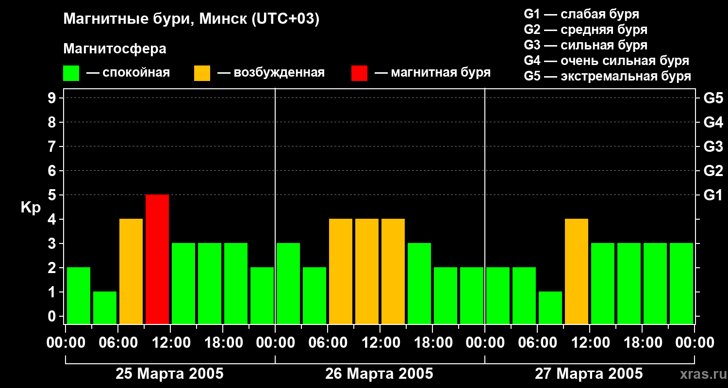 Изменения геомагнитного индекса Kp с 25 по 27 марта 2005 года для средних широт