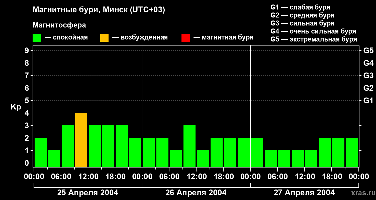 Изменения геомагнитного индекса Kp с 25 по 27 апреля 2004 года для средних широт