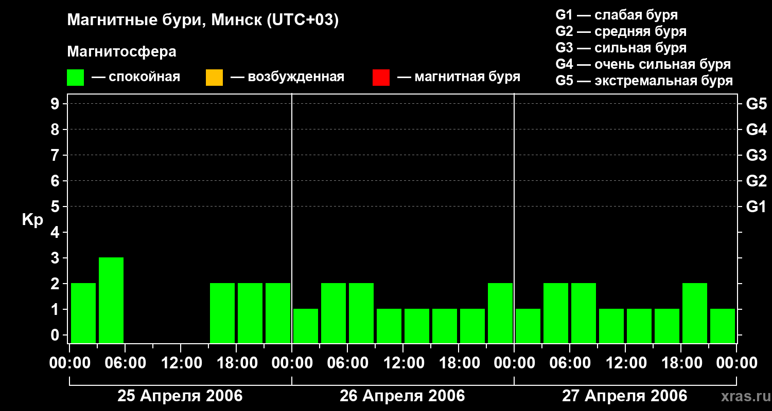 Изменения геомагнитного индекса Kp с 25 по 27 апреля 2006 года для средних широт