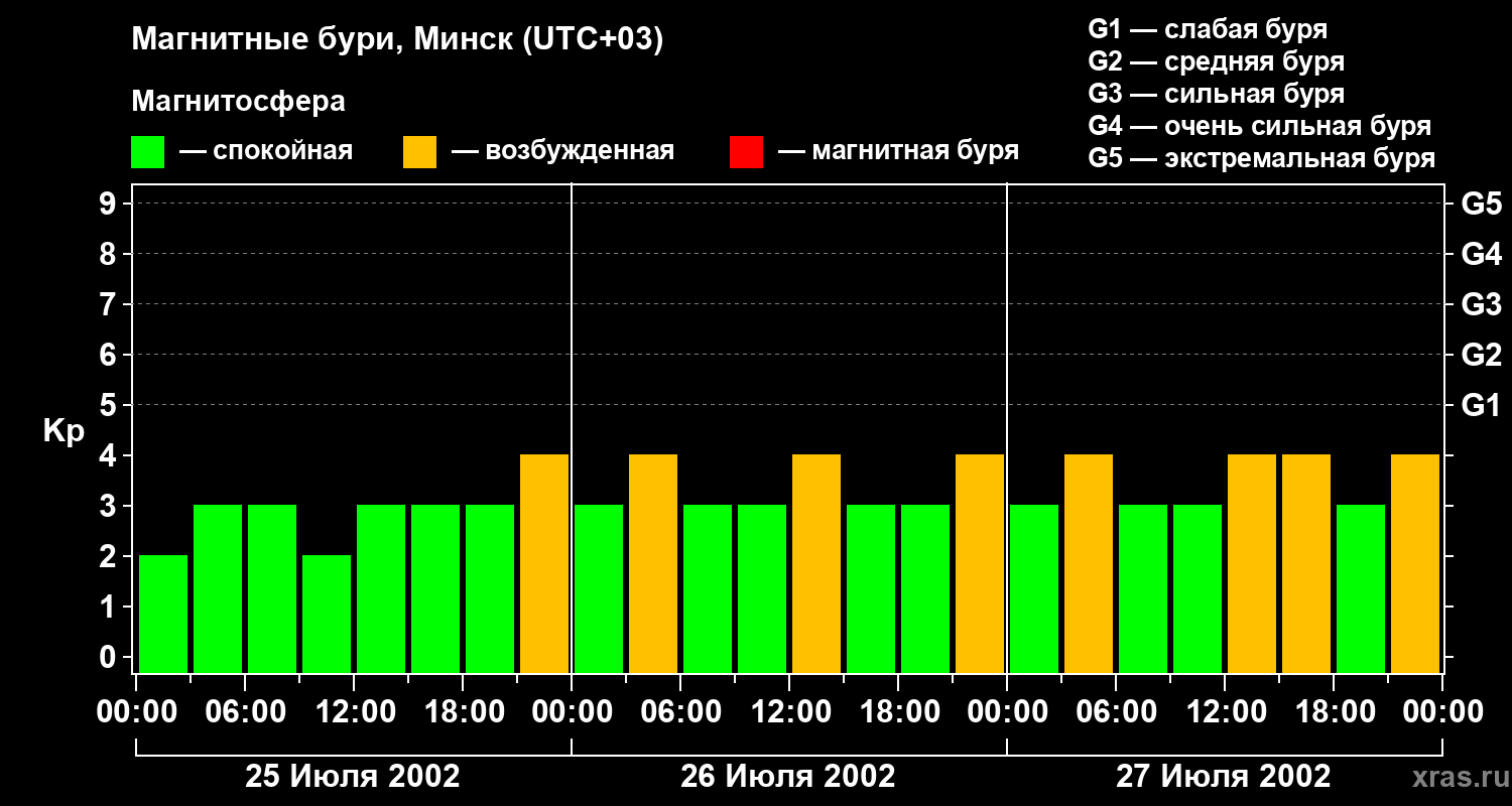 Изменения геомагнитного индекса Kp с 25 по 27 июля 2002 года для средних широт