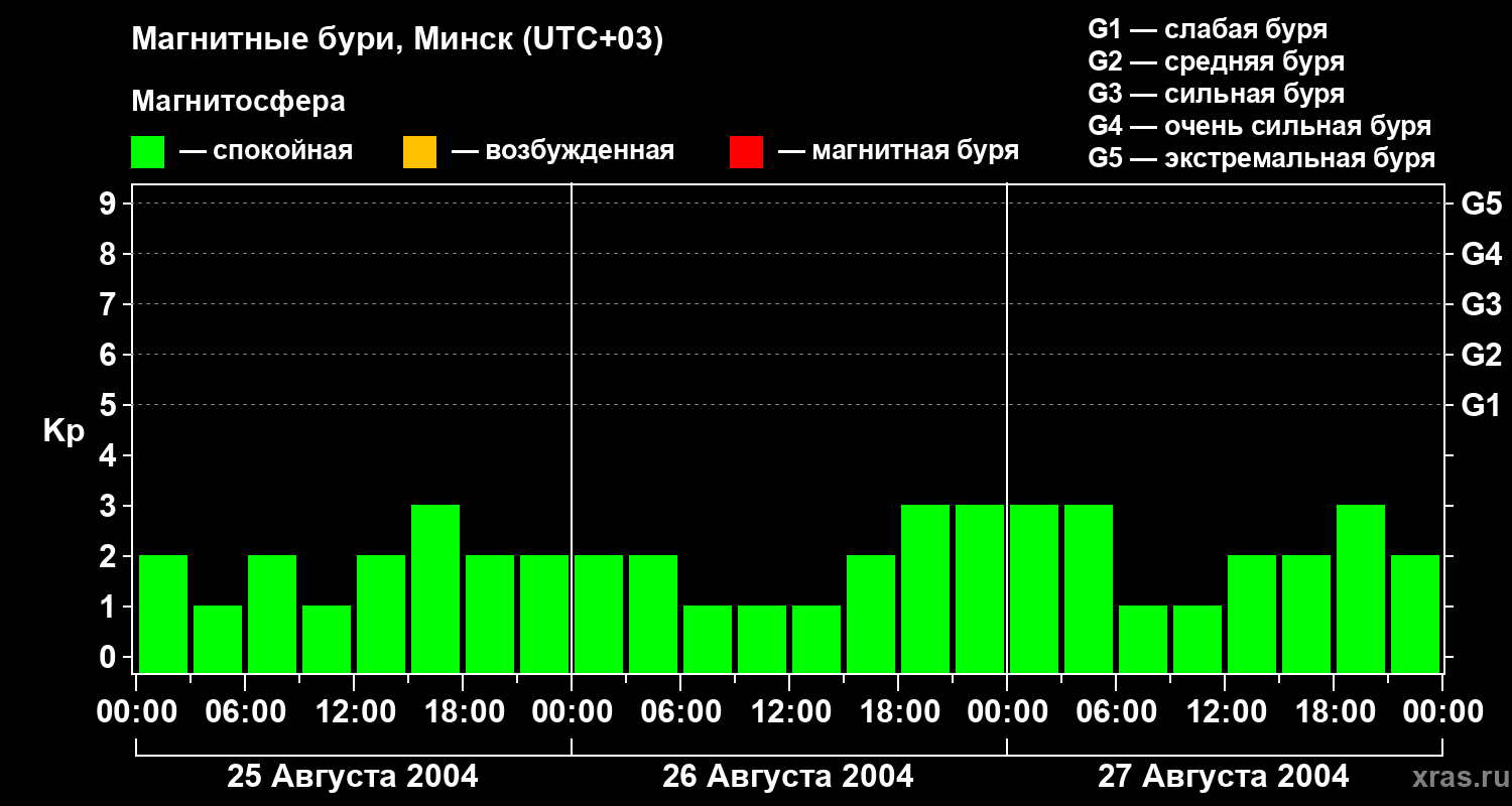 Изменения геомагнитного индекса Kp с 25 по 27 августа 2004 года для средних широт