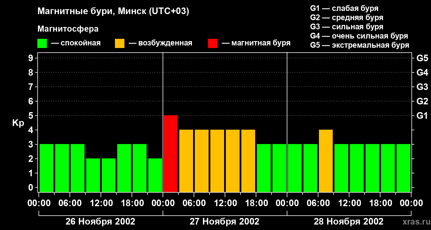 Изменения геомагнитного индекса Kp с 26 по 28 ноября 2002 года для средних широт