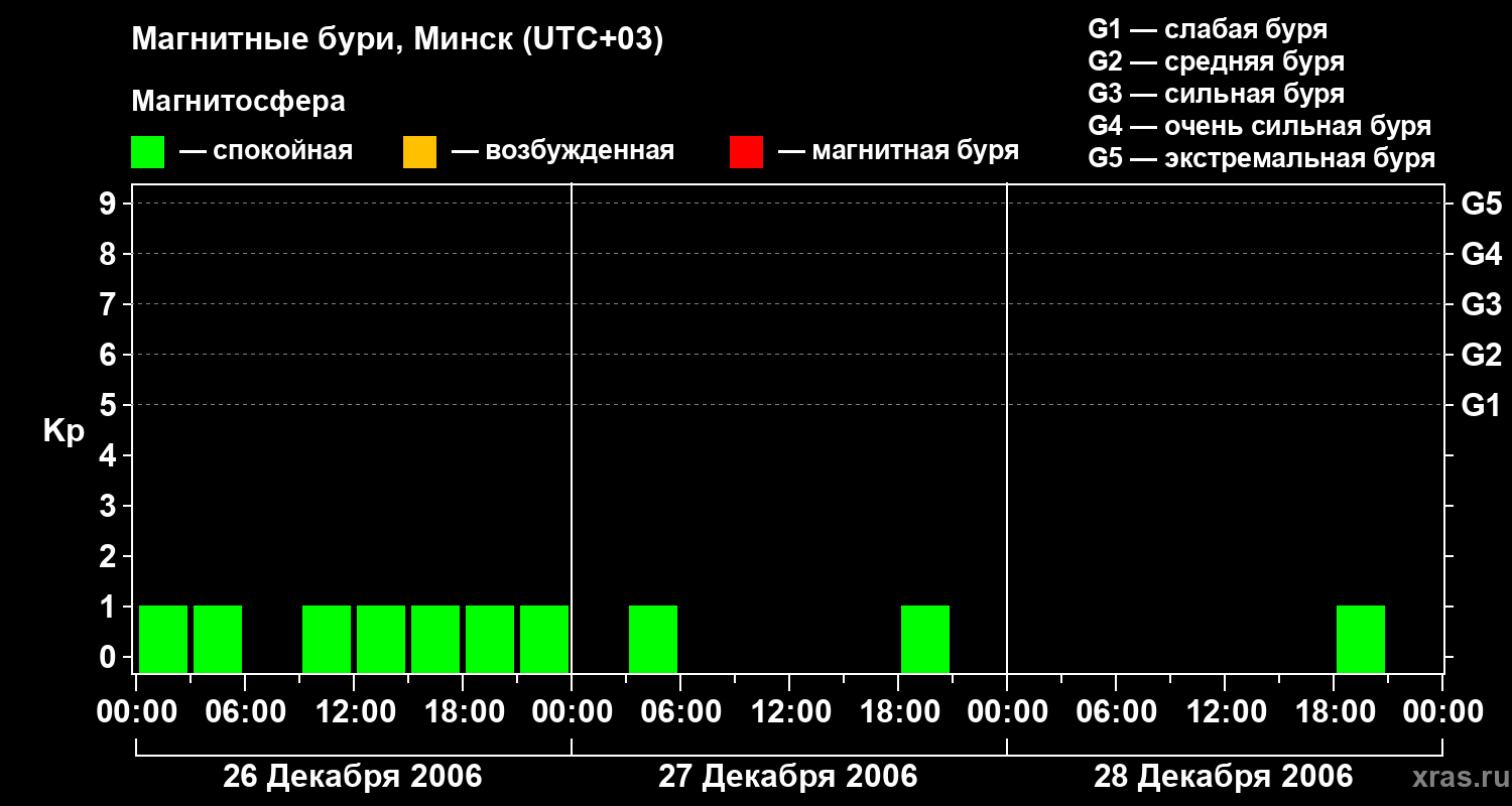 Изменения геомагнитного индекса Kp с 26 по 28 декабря 2006 года для средних широт