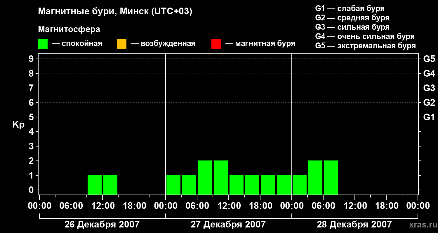 Изменения геомагнитного индекса Kp с 26 по 28 декабря 2007 года для средних широт