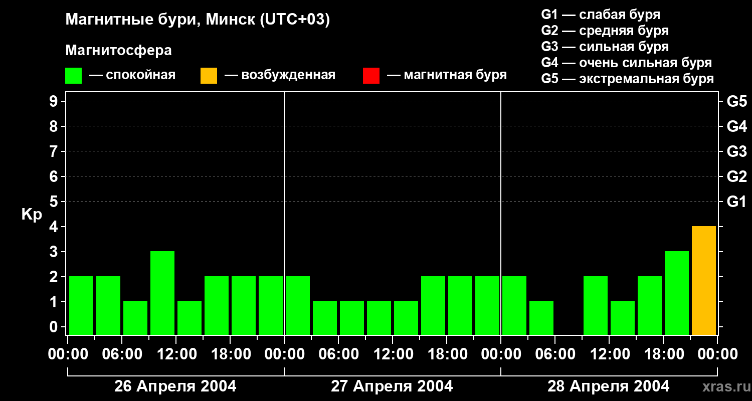Изменения геомагнитного индекса Kp с 26 по 28 апреля 2004 года для средних широт