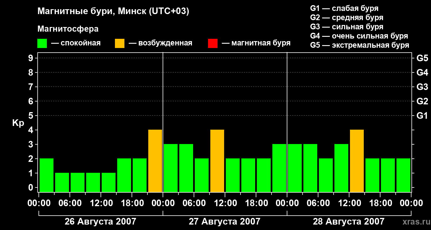 Изменения геомагнитного индекса Kp с 26 по 28 августа 2007 года для средних широт