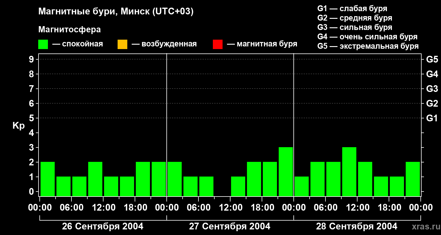 Изменения геомагнитного индекса Kp с 26 по 28 сентября 2004 года для средних широт